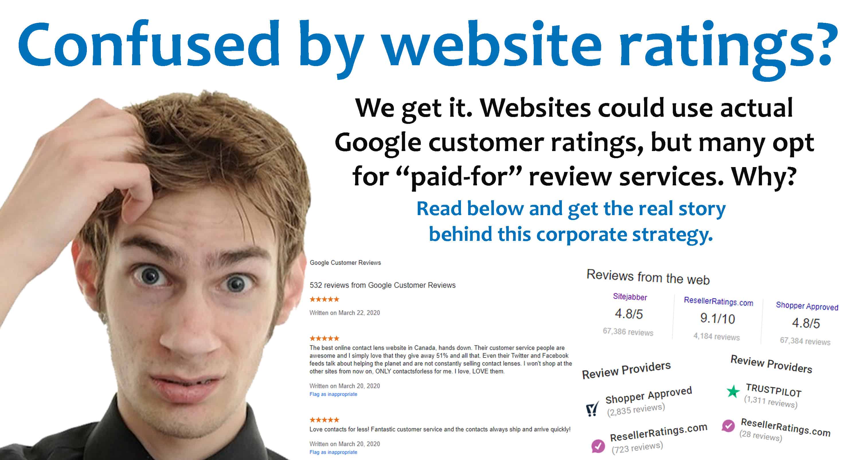So, it is our view that you should always buy your contact lenses based on Google Customer Reviews, not “partner sites”. Why? When you receive unalterable reviews that cannot be negotiated or bribed into being changed, you know you are getting the real information on a company. Buy smart and you will always buy happier.