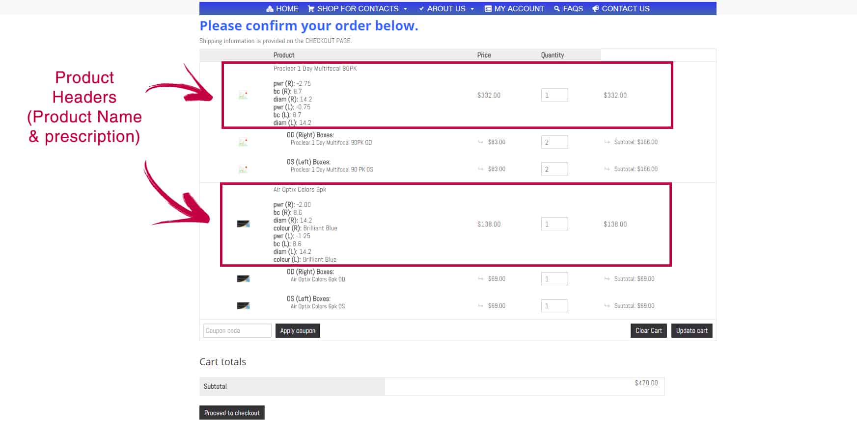 - The prescription you put in for this product (this is a great time to double-check that it’s correct! If it’s wrong, please delete it and reorder as you cannot edit it in the cart. )